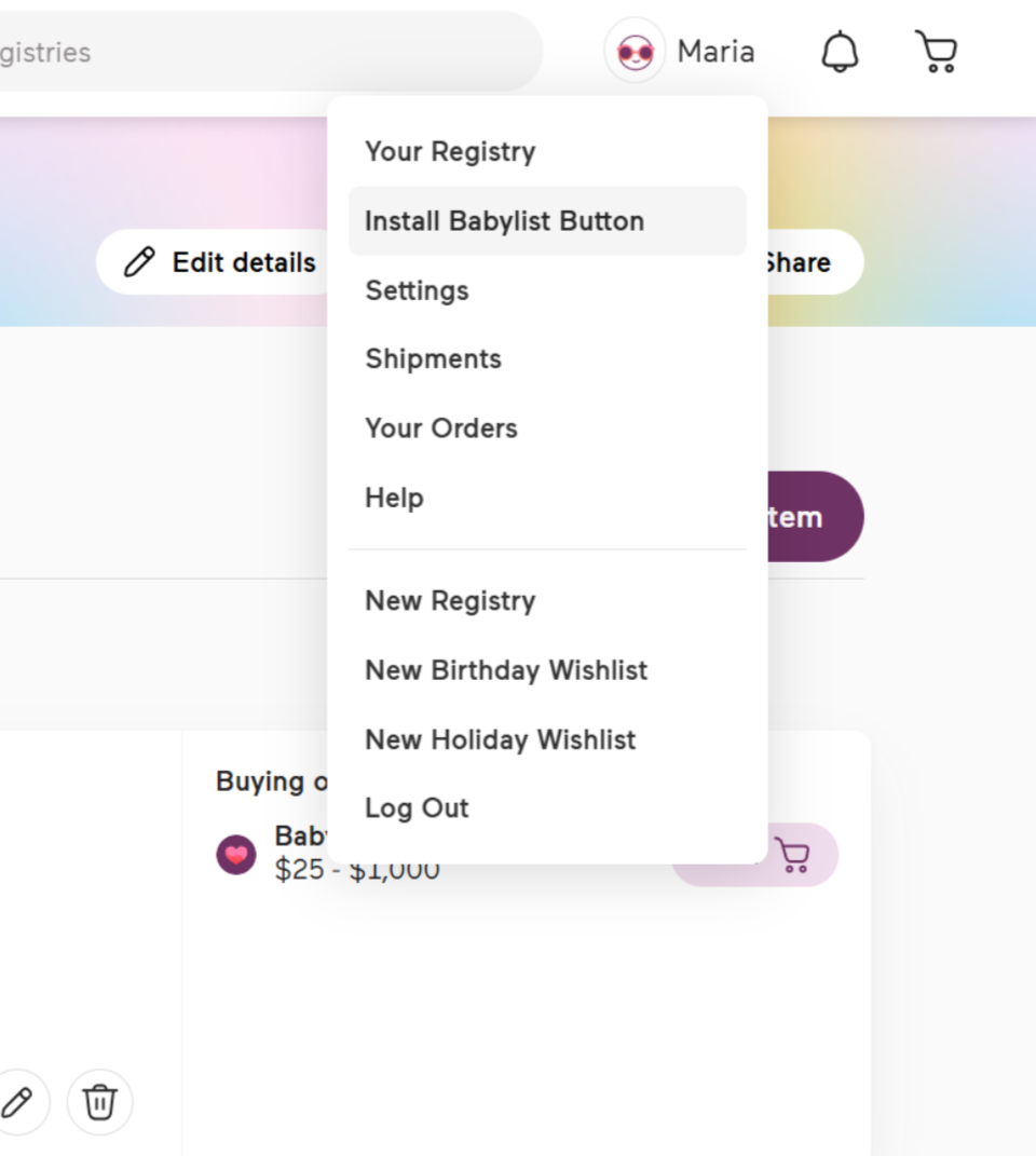 Once you’re logged into your registry, hover over your name and select “Install Babylist Button”.