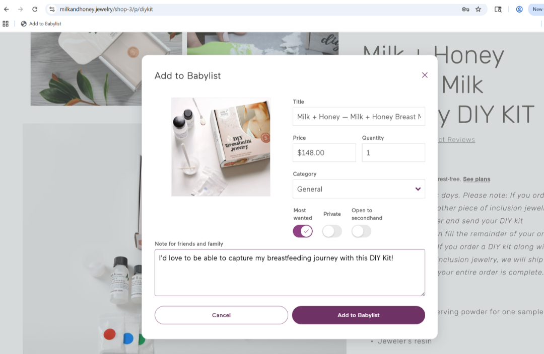 5. Head to Milk + Honey’s DIY KIT or GIFT CERTIFICATE page. Once you’re on the product page you wish to add to your Babylist registry, simply click the “Add to Babylist” button in your bookmarks bar.